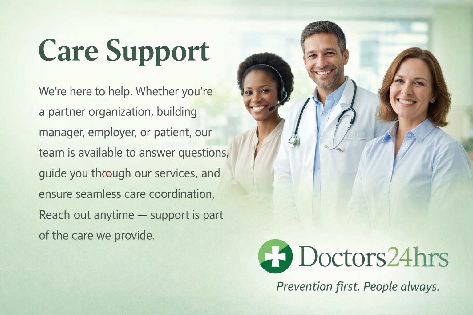We’re here to help. Whether you’re a partner organization, building manager, employer, or patient, our team is available to answer questions, guide you through our services, and ensure seamless care coordination. Reach out anytime — support is part of the care we provide.
